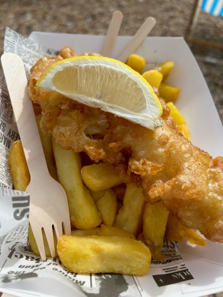 3. Brighton: tutustumiskäynti Brightonissa ja suosittu rantaruoka fish and chips; kolme viimeistä kuvaa.